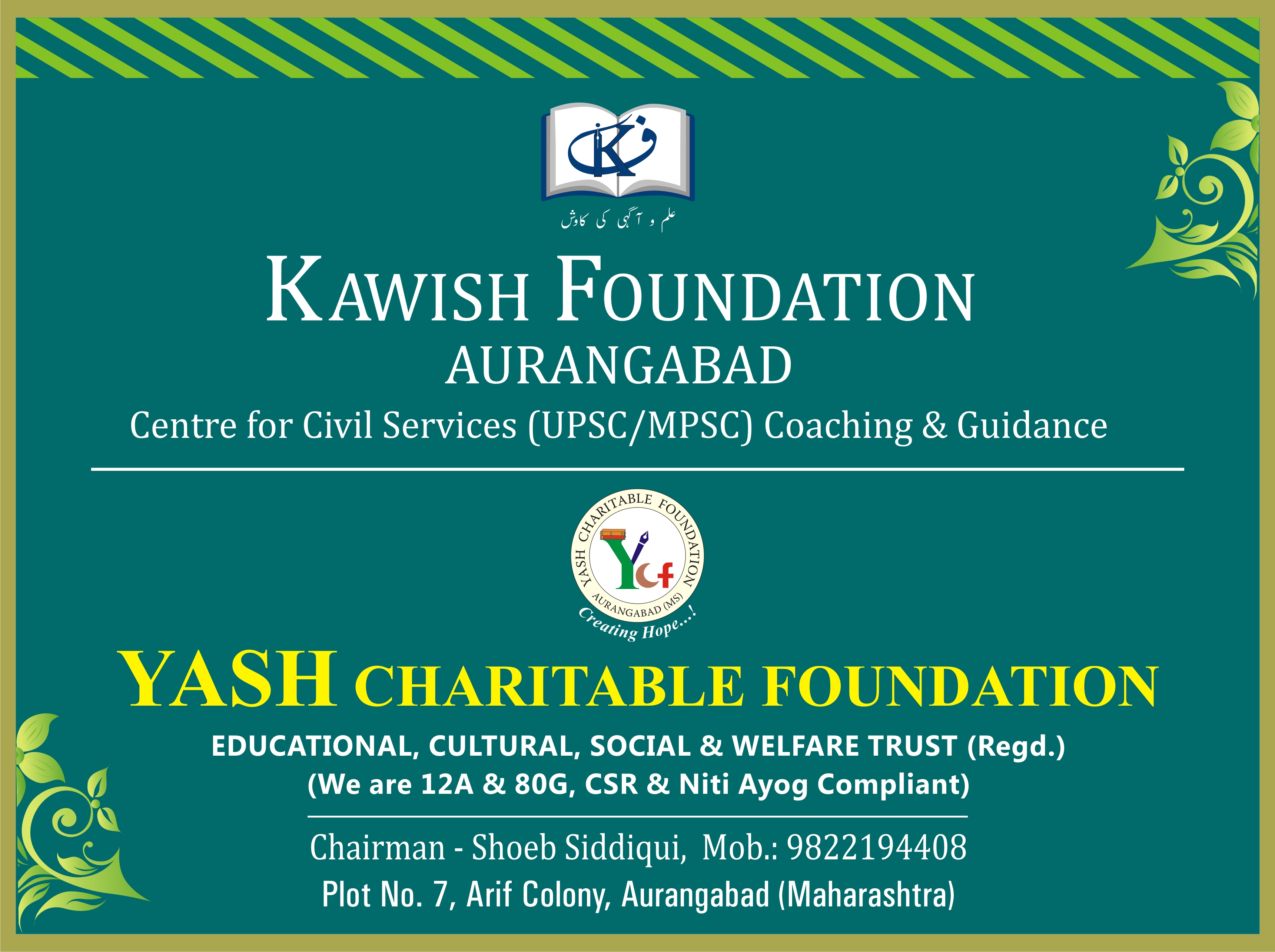 Affiliation In this humongous task, the foundation has collaborated with Zakat Foundation Of India (ZFI), Sir Syed Educational Revolution Mission (SSERM), and Hamdard Study Circle (HSC) in Delhi. The collaboration aims to conduct and facilitate coaching and guidance for students from the Marathwada region, as well as provide support for sending them to institutions such as Jamia Milia Residential Coaching Academy, Jamia Hamdard, Zakat Foundation of India, Sir Syed Educational Revolution Mission, and Hamdard Study Circle in Delhi. (photos of hsc, zfi, etc)